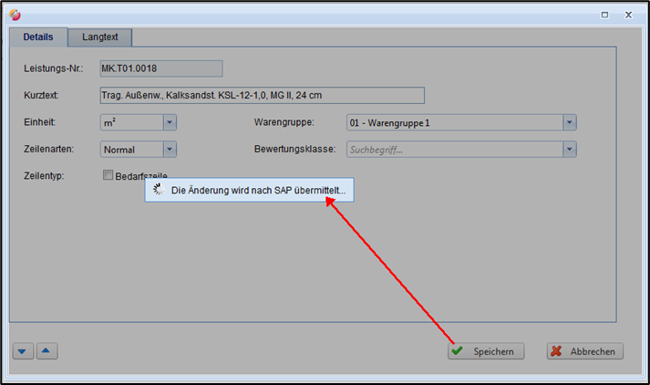 Sollte die Leistungszeile bereits nach SAP übermittelt worden sein ( → Leistungsstämme in SAP anlegen / ändern.), so wird mit dem Speichern die Änderung automatisch nach SAP übertragen.