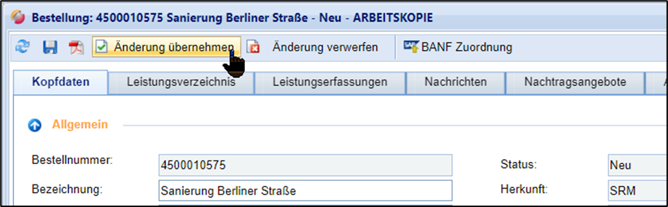 Die Arbeitsversion der Bestellung wird als neue freigegebene Version festgeschrieben (→ Änderungen werden übernommen)