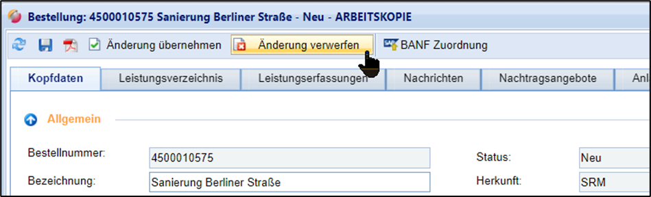 Mit Klick auf den Button „Änderung verwerfen“ wird die Arbeitsversion gelöscht, alle durchgeführten Änderungen gehen dabei verloren. Angezeigt wird die vorherige Version, alle Felder sind für Änderungen gesperrt. Um erneut Änderungen vornehmen zu können, muss wieder der Button “Bestellung ändern“ angeklickt werden.