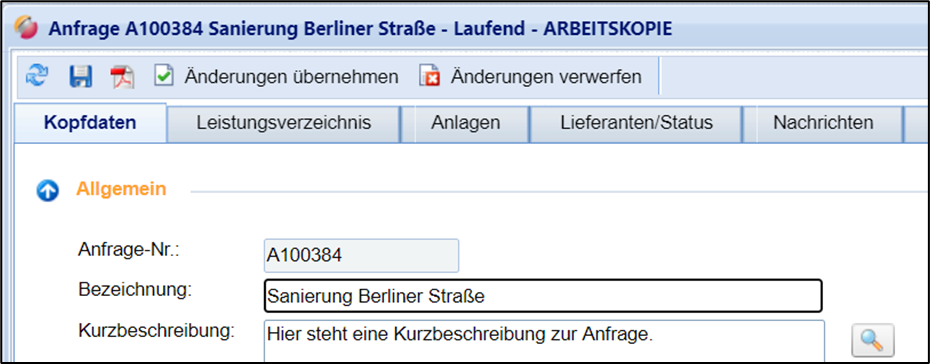 Die Änderungen werden in die Anfrage übernommen und den Lieferanten angezeigt.