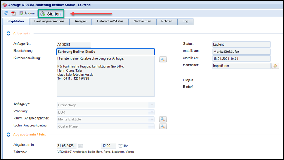 Sobald Sie alle erforderlichen Daten in der Anfrage ergänzt haben (→ Leistungsverzeichnis, Lieferanten) können Sie die Anfrage starten/aktivieren. Mit der Aktivierung wird die Anfrage den ausgewählten Lieferanten zugestellt, diese werden mittels E-Mail über die Anfrage informiert.