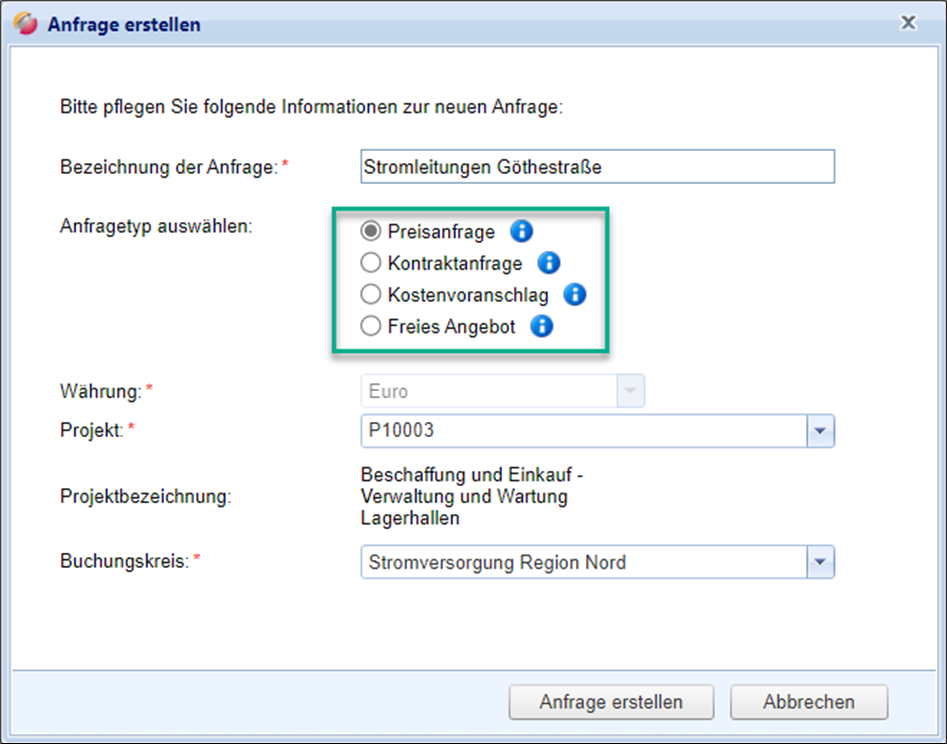 Dieser Anfragetyp, der auf einer Preisanfrage und einem Kostenvoranschlag basiert, ermöglicht Ihnen eine Anfrage zu erstellen, in der die Lieferanten anhand Ihrer vorgegebenen Quellen für das Erstellen des Angebots zugreifen können.