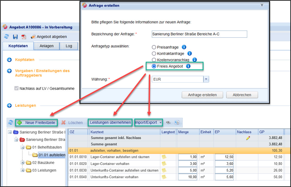 Optionen für die Angebotserstellung beim freien Angebot