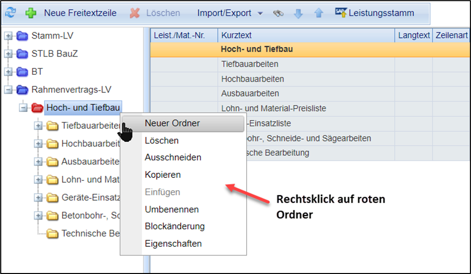Wählen Sie einen Hauptordner aus, unter dem das neue Stamm-Leistungsverzeichnis erstellt werden soll und wählen Sie rechte Maustaste > neues LV