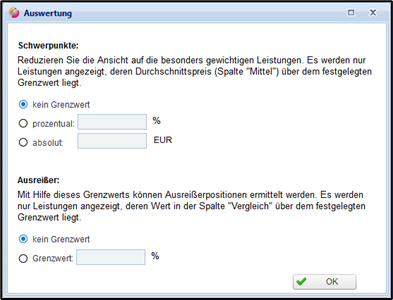 Durch Eingabe des Grenzwerts (prozentual, absolut) können Leistungen mit einem geringen Anteil am Gesamtumfang der Angebotssumme ausgeblendet werden.