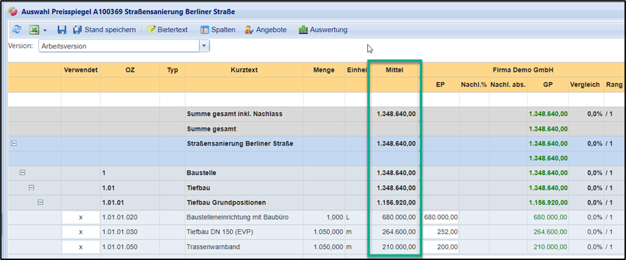 Asicht im Preisspiegel inkl. Spalte „Mittel“
