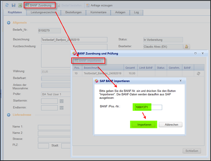 Die BANF wird aus SAP importiert und dem Bedarf zugeordnet.
