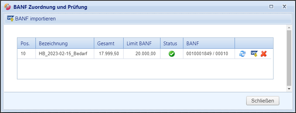 Die Nummer der aktuell zugeordneten BANF sowie das Datum des Einlesens aus SAP werden dann angezeigt.