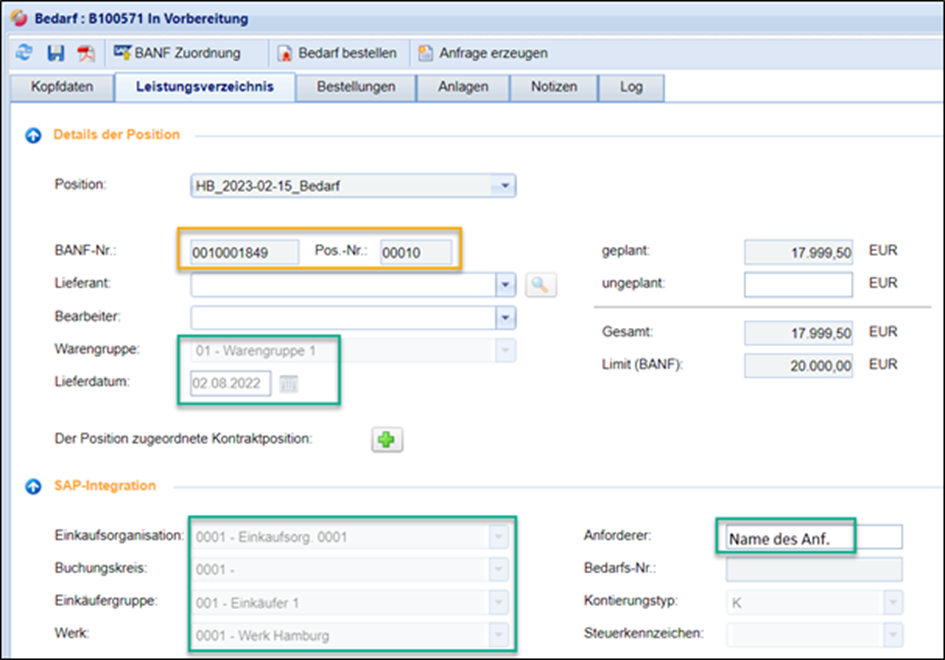 Nach erfolgreichem Import, werden die Daten zur BANF im Bereich „SAP Daten“ unter dem Reiter „Leistungsverzeichnis“ angezeigt.