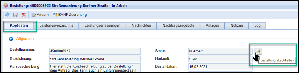 Eine Bestellung kann auch manuell als „abgeschlossen“ markiert werden, ohne dass eine Schlusserfassung freigegeben wurde.