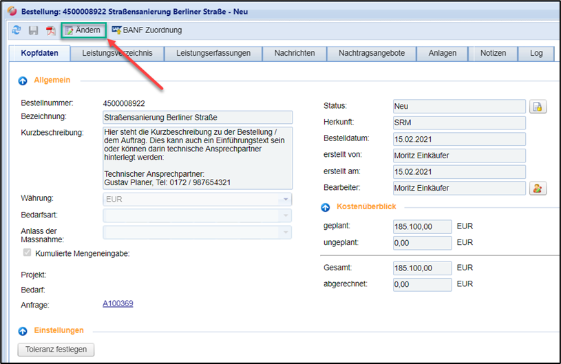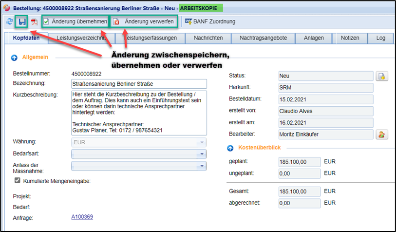 Daraufhin wird die Arbeitsversion (Kopie der aktuellen Bestellung) erstellt und Sie können Ihre Änderungen vornehmen: