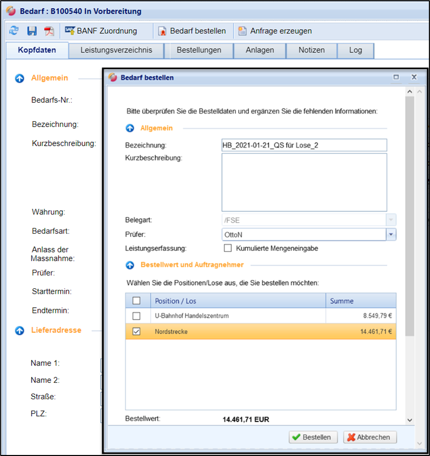 Wenn alle Musskriterien für ein Los (=Bestellposition) gepflegt sind, kann die Bestellung mit dem Button “Bestellen” ausgelöst werden. Es öffnet sich daraufhin das Dialogfenster für die finalen Auswahlfelder, z.B. die Auswahl des Prüfers. Mit dem Button wird die Bestellung ausgelöst: