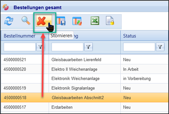 Bestellungen, die aus dem Angebot oder einem Bedarf erstellt wurden, können direkt in FUTURA Engineering storniert werden: Öffnen Sie hierzu eine Vorgangsliste, in der die Bestellung erscheint (z.B. Bestellungen gesamt), wählen Sie aus der Liste die zu stornierende Bestellung auf und klicken auf den Button in der Buttonleiste: