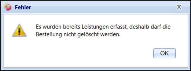 Hinweismeldung beim Stornieren einer Bestellung mit erfassten Leistungen