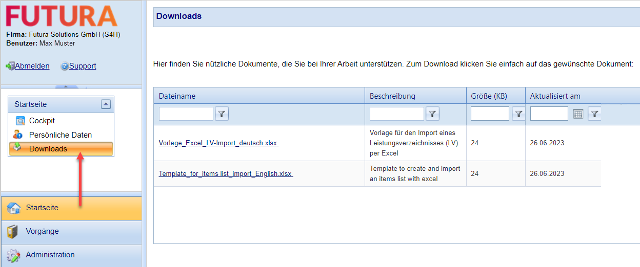 Im Bereich „Downloads“, unter “Startseite”, finden Sie Mustervorlagen für den Import aus Excel für die Erstellung von Leistungsverzeichnissen. Haben Sie eigene Dokumente, die Ihren Mitarbeitern zur Verfügung stehen sollen, so können wir diese ebenfalls im Downloadbereich von FUTURA Engineering einbinden. Diese können uns von Ihrem Administrator zur Verfügung gestellt und für den Upload beauftragt werden.
