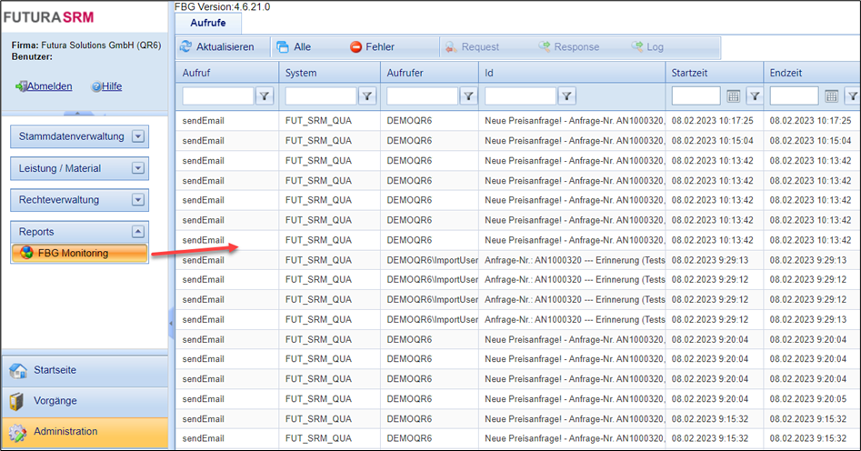 Das FBG Monitoring ist eine Monitoring-Oberfläche, indem alle Schnittstellenaufrufe zwischen dem FUTURA Business Gateway (FBG) und den angebundenen Systemen (FUTURA, SAP etc.) angezeigt werden.