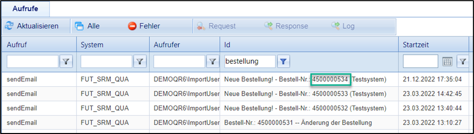 Aufrufer | Name des Users, der den Aufruf auslöst. Es wird immer der User des Sendesystems angezeigt, deshalb kann die Anzeige ein unterschiedliches Format aufweisen. FUTURA-User werden z.B. im Format FIRMEN_LOGIN/USERNAME angezeigt. |