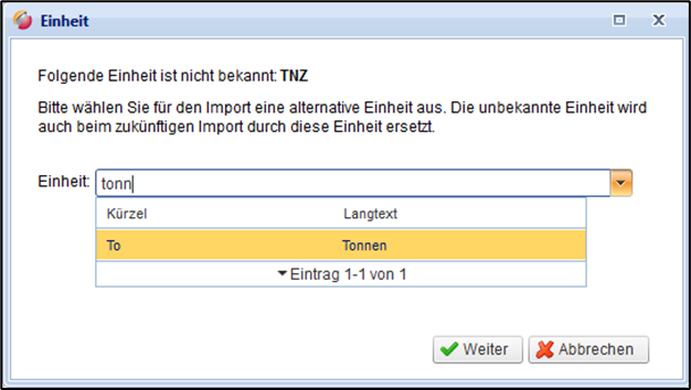 Sie können dann aus dem Drop-Down-Fenster die passende Einheit selektieren. Mit Klick auf „Weiter“ wird der Import fortgesetzt und die unbekannte Einheit wird beim Import durch die ausgewählte Einheit ersetzt. Sollten weitere Einheiten unbekannt sein, so erscheint das Hinweisfenster erneut.