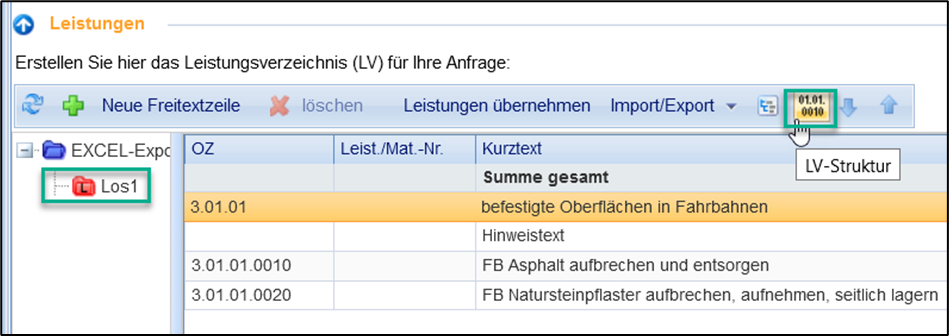 Mit der Verwendung von Lospositionen (Lose), können Sie auch mehrere Leistungsverzeichnisse mittels Excel-Datei importieren. Im LV-Editor auf der Oberfläche muss zunächst über den Button „LV-Struktur“ vorausgewählt sein, dass Lose verwendet werden.