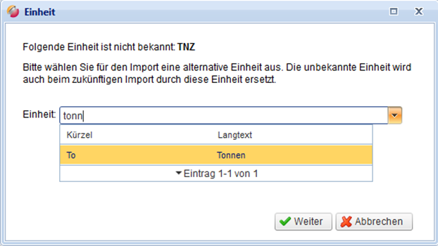 Sie können dann aus dem Drop-Down-Fenster die passende Einheit selektieren. Mit Klick auf „Weiter“ wird der Import fortgesetzt und die unbekannte Einheit wird beim Import durch die ausgewählte Einheit ersetzt. Sollten weitere Einheiten unbekannt sein, so erscheint das Hinweisfenster erneut.