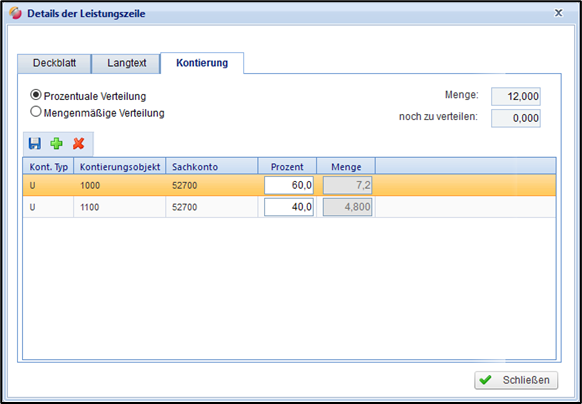 Eine Kontierung auf Leistungszeilenebene ist zusätzlich möglich. Im Detailfenster einer Leistungszeile wird die Kontierung im gleichnamigen Registerreiter durchgeführt. Im Kopf kann zwischen prozentualer und mengenmäßiger Verteilung unterschieden werden. Wenn die Option prozentuale Verteilung aktiviert ist, sind die Prozentwerte editierbar. Wenn die Option mengenmäßige Verteilung aktiviert ist, sind die Mengenwerte editierbar. Auch auf dieser Ebene müssen bei prozentualer Verteilung die Mengen 100% der Gesamtmenge betragen und bei mengenmäßiger Verteilung die Mengen der Leistungszeile vollständig verteilt werden.