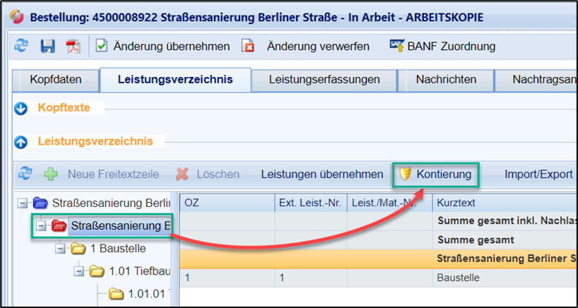 Es besteht die Möglichkeit, dass die Kontierung pauschal für alle Leistungen eines Ordners (Bestellposition, Titel, Untertitel) festgelegt und sie somit auf die untergeordneten Leistungszeilen vererbt wird. Hierfür muss der Zielordner zunächst ausgewählt werden. Daraufhin wird der Button für die Kontierung aktiv. Bei der Bedarfserstellung, im Registerreiter Leistungsverzeichnis, wird der Button für die Kontierung in der Buttonleiste angezeigt: