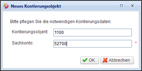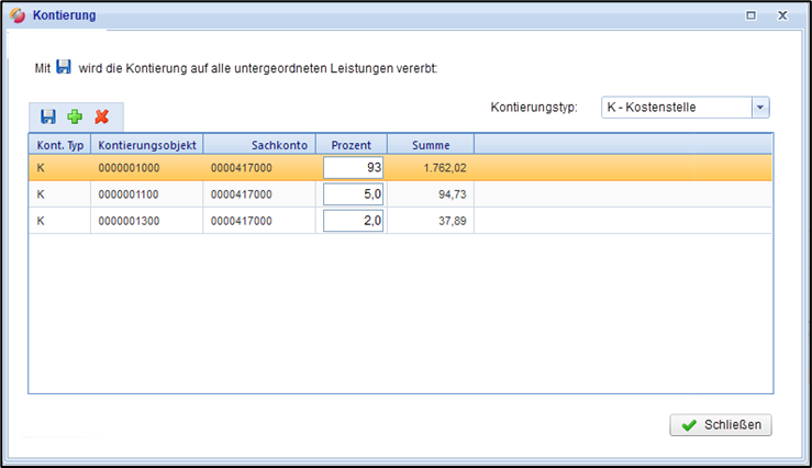 Mit Klick auf den “+”-Button kann ein neues Kontierungsobjekt hinzugefügt werden. Das Kontierungsobjekt erhält automatisiert den festgelegten Kontierungstyp der übergeordneten Position.