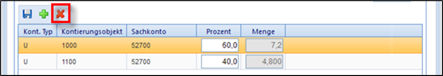 Mit Klick auf kann ein zugeordnetes Kontierungsobjekt aus der Liste wieder gelöscht werden. Hierfür muss zuerst die zu löschende Zeile mit Mausklick markiert werden.