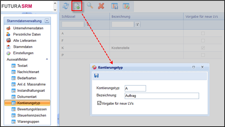 Für die Kontierungen von Bestellpositionen und/oder einzelner Leistungserfassungen (Lerf), sind Kontierungstypen erforderlich. In diesem Bereich pflegen Sie die vorgegebenen Kontierungstypen aus Ihrem SAP-System. Nur wenn diese gepflegt sind, stehen sie bei der Kontierung einer Bestellposition in einer Bestellung mit Start in FUTURA Engineering oder in einer Leistungserfassung zur Auswahl.