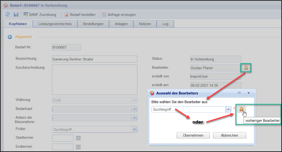 Alternativ kann mit dem Button „vorheriger Bearbeiter“, innerhalb des Fensters „Auswahl des Bearbeiters“, ein User (z.B. ein interner oder externer Planer/LV-Ersteller) die Bearbeitung des Belegs nach Beendigung seines Aufgabenbereichs zurück an den vorherigen Bearbeiter des Belegs übergeben.