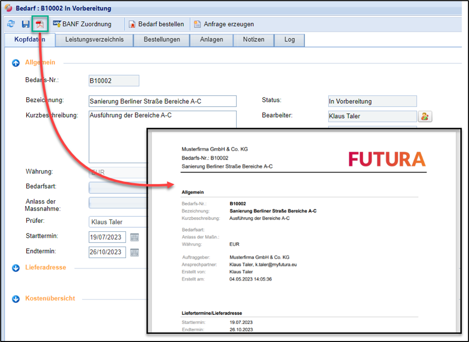 Kopfdaten pflegen und PDF aus dem Bedarf generieren
