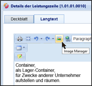 4. Pflegen Sie ggf. einen Langtext zur Leistungszeile. Wechseln Sie hierzu in den Reiter „Langtext“. Sie können hierfür Text-Formatierungen vornehmen und ggf. Bilddateien zur Beschreibung hinzufügen.