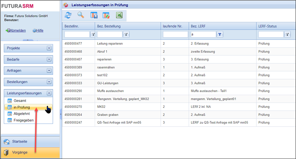 Eine Lerf kann erst an den Prüfer übermittelt werden, wenn alle vorangegangenen Lerfs freigegeben wurden bzw. sich keine in der Reihenfolge darunter liegenden Leistungserfassungen im Status “in Arbeit” oder “Abgelehnt” befinden (Anhaltspunkt für die Reihenfolge → Spalte “Laufende Nr.”).