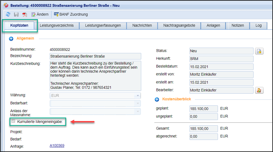 Sollte die Bestellung ihren Ursprung aus FUTURA Engineering haben, kann die Option „kumulierte Mengeneingabe“ genutzt werden. Diese Option wird bereits bei der Bestellanlage FUTURA Engineering gesetzt und hat zur Folge, dass der Lieferant seine Aufmaße kumuliert erfassen muss. Das bedeutet, dass er neu erbrachte Leistungen zu den bisher abgerechneten, bereits freigegebenen Mengen addieren muss. Im Abschnitt „Allgemein“ unter der Registerkarte „Kopfdaten“ können Sie sehen, ob die Option „Kumulierte Mengeneingabe“ gesetzt ist.