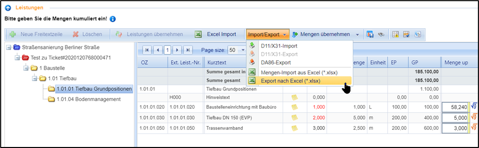 Zunächst exportieren Sie das Leistungsverzeichnis mit „Export nach Excel (*xlsx)“. Das beauftragte Leistungsverzeichnis, inkl. ggf. vom Lieferanten selbst hinzugefügte Leistungen per Freitextzeile oder Kontraktzeilen (nur bei einer ungeplanten Bestellung möglich) werden im Export ebenfalls berücksichtigt.