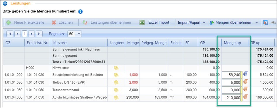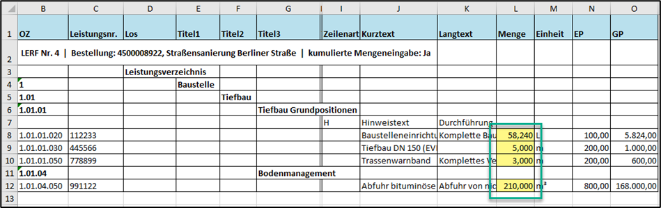 Die exportierte Excel-Datei beinhaltet farblich gekennzeichnete Felder (Spalte „L“), in die Sie Ihre geprüften Mengen eintragen können. In späteren Leistungserfassungen, zu denen die Mengen kumuliert eingegeben werden müssen, werden die bereits erfassten Mengen darin angezeigt. In diesem Fall geben Sie die geprüften Mengen zu der aktuellen Leistungserfassung kumuliert ein.