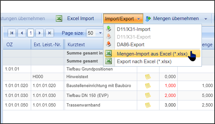 Nachdem Sie die Mengen erfolgreich in Excel eingetragen und die Datei lokal gespeichert haben, können Sie mit der Funktion „Mengen-Import aus Excel (*.xlsx)“ Ihr korrigiertes Aufmaß in FUTURA Engineering importieren.