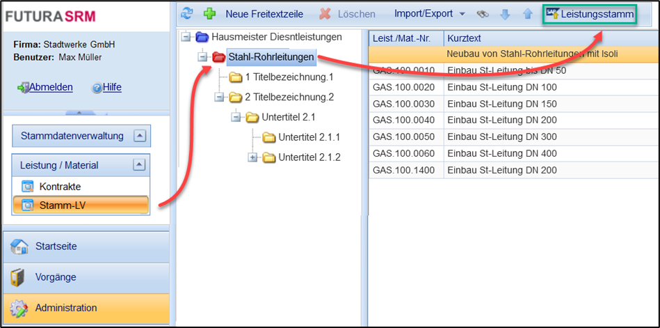 In FUTURA Engineering können Sie die Leistungen eines Stamm-LVs nach SAP übertragen und dort als Leistungsstämme anlegen.