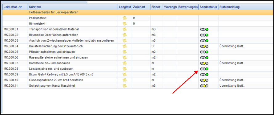 Bei größeren LVs kann die Übertragung einige Zeit in Anspruch nehmen (ca. 3-4sec pro Leistungszeile!). Bitte warten Sie, bis die Übertragung erfolgreich abgeschlossen wurde. Anhand des Sendestatus zu jeder Zeile können Sie den Stand der Übertragung verfolgen:
