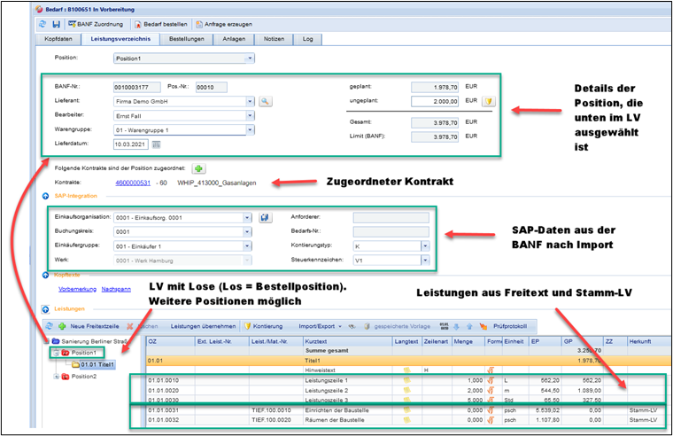 Übersicht Registerreiter Leistungsverzeichnis im Vorgang „Bedarf“
