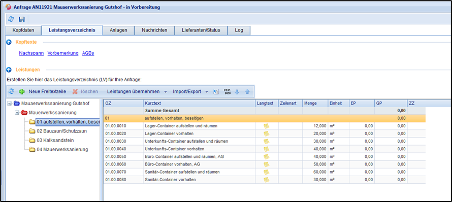 Auf dem Registerreiter „Leistungsverzeichnis“ können Sie das LV für die geplante Anfrage erstellen oder importieren.