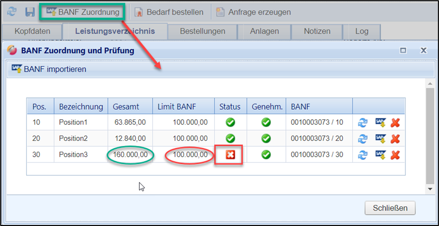 Wenn Sie in Ihrer Organisationseinheit die in SAP erstellte BANF in FUTURA Engineering importieren, achten Sie darauf, dass die Limits in den BANFen ausreichend für Ihre kalkulierten Leistungen sind. Beim Bestellen werden die aus der BANF übernommenen Positionslimits überprüft. Wird ein Limit überschritten, so ist der Bestellvorgang nicht möglich.