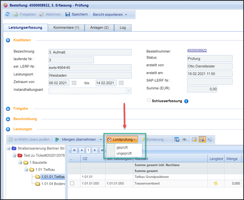 Bei Bestellungen mit ungeplanten Leistungen (Limitbestellung) können Sie eine Limitprüfung für eine gewählte Leistungserfassung durchführen, und sehen, ob die festgelegten Limits eingehalten werden. Um eine Limitprüfung durchzuführen, gehen Sie bitte wie folgt vor: