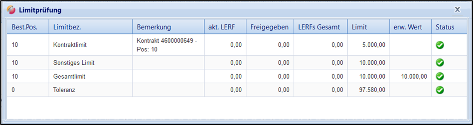 Den Status der Limitprüfung können Sie pro festgelegtes Limit der Spalte „Status“ entnehmen. Ist ein Limit überschritten, so ist der Status gleich . Die Freigabe der Erfassung kann in diesem Fall nicht durchgeführt werden.