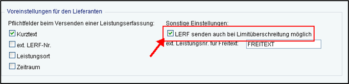 Sie können jedoch im Menü Administration / Einstellungen diese Prüfung ausschalten, in diesem Fall kann der Lieferant eine Leistungserfassung an den Prüfer auch dann senden, wenn definierte Limits überschritten werden.