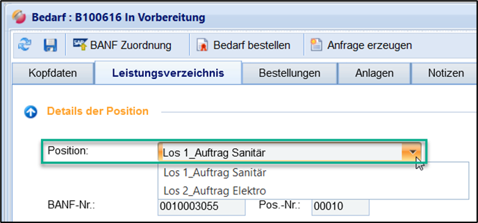 Nach dem Sie das LV mit Losen importiert oder im Bedarf erstellt haben, kann im Auswahlfenster „Position“ zwischen den einzelnen Losen, die je getrennte Bestellpositionen darstellen, ausgewählt werden. Die Zuordnung der SAP-Integration und Auswahl des Lieferanten etc. werden daraufhin darunter angezeigt und erfolgen getrennt voneinander. Das gesamte LV mit allen Losen wird im unteren Bereich immer vollständig angezeigt. Wenn Sie sich für die Erstellung des LVs aus den verfügbaren Belegen bedienen, (z.B. aus Kontrakten) werden Sie vom System gefragt, zu welchem Los Sie Leistungszeilen hinzufügen möchten.