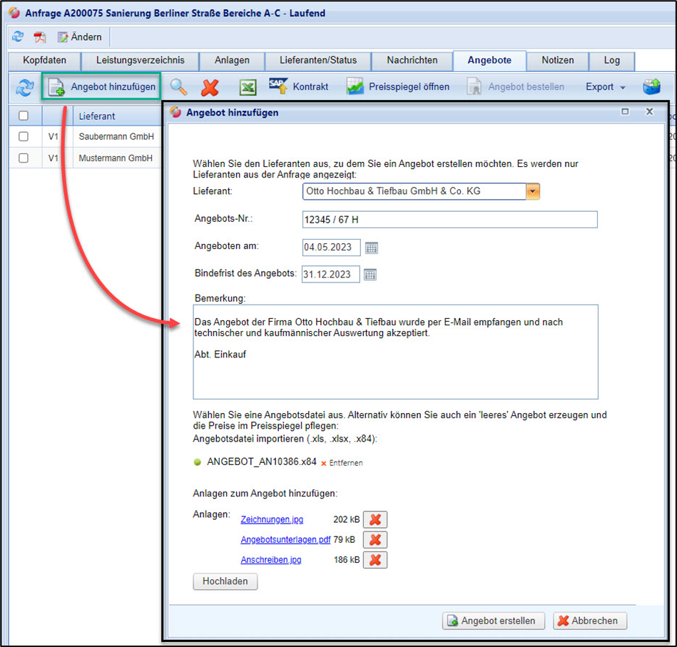 Zu Ihrer Auswertung können Sie nachträglich Angebote von Lieferanten selbst und mit den bekannten Methoden per GAEB oder Excel pflegen. Verspätete oder am System vorbei eingereichte Angebote können damit in die Angebotswertung des Preisspiegels berücksichtigt werden. Selbiges gilt auch für zusätzlich eingereichte Angebotsunterlagen, die Sie ebenfalls dem Angebot anhängen können.