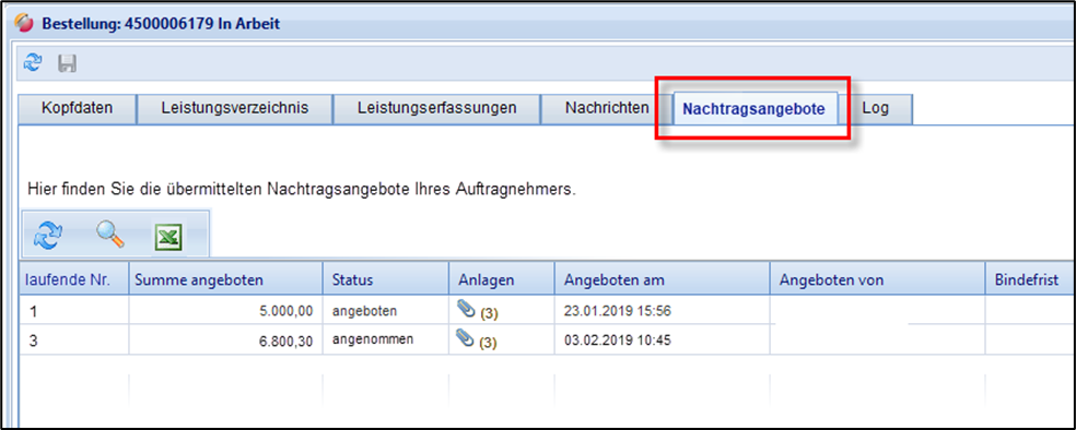 Eine Übersicht eingereichter Nachtragsangebote finden Sie im gleichnamigen Registerreiter. Es können mehrere Nachtragsangebote versendet werden. Sobald ein Nachtragsangebot zu einer Bestellung vorliegt, werden Sie per E-Mail informiert.