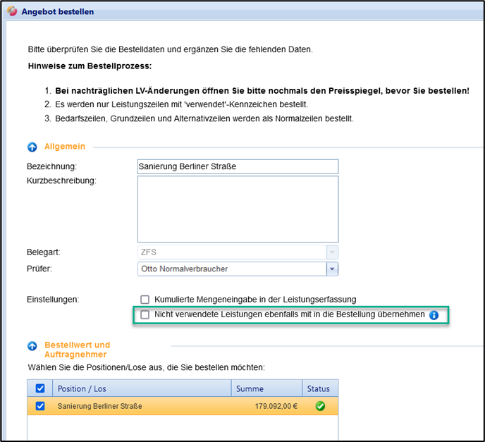 Sollten Sie zuvor im Preisspiegel Leistungszeilen de-selektiert haben („x“ für „verwendet“ wurde entfernt), die im späteren Verlauf des Auftrags nach Bedarf dennoch beauftragt werden könnten, so können Sie die Option „Nicht verwendete Leistungen ebenfalls mit in die Bestellung übernehmen“ im Dialogfenster für die Bestellauslösung setzen. Ist die Option angehakt, werden auch diese Leistungen mit in die Bestellung übernommen und dort als Bedarfszeilen angelegt. Diese können dann im späteren Verlauf des Auftrags nachträglich zu Normalpositionen umgewandelt werden, damit sie in den Leistungserfassungen vom Auftragnehmer erfasst werden können.