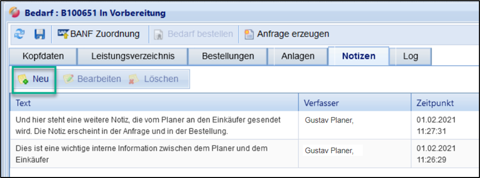 Zum Bedarf können beliebig viele Notizen angelegt werden. Notizen sind fortlaufend und sollen den Bearbeitern des Bedarfs zum Kommunikationsaustausch dienen.
